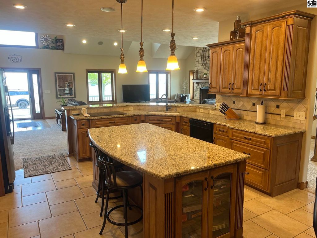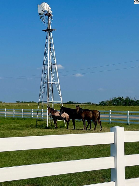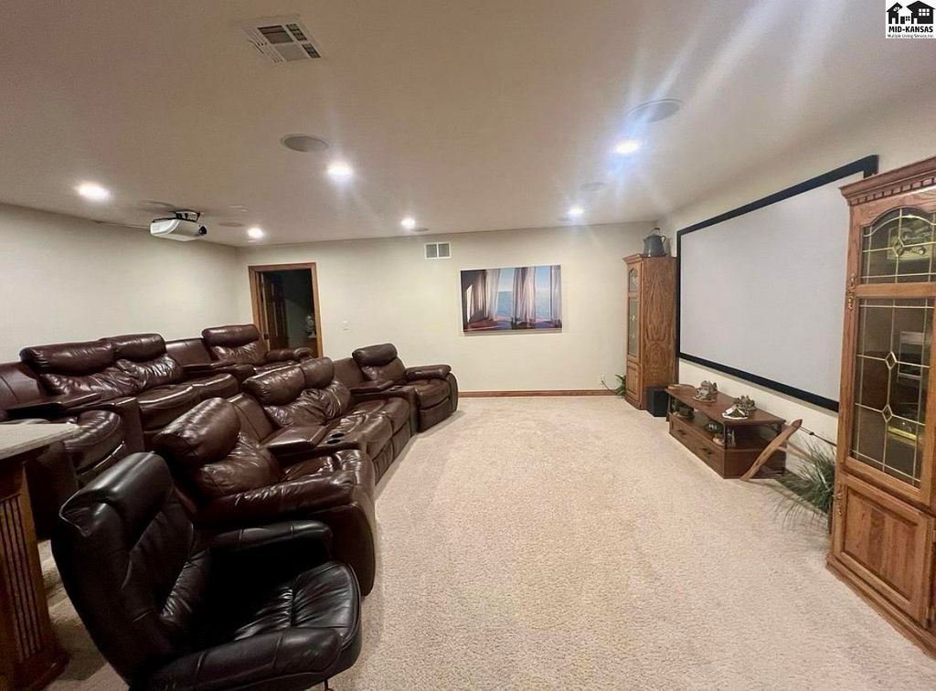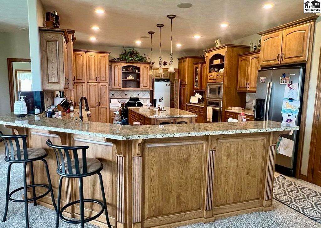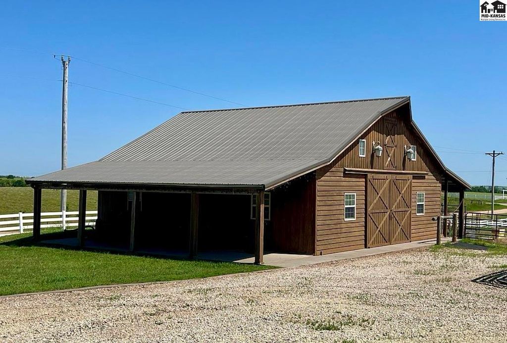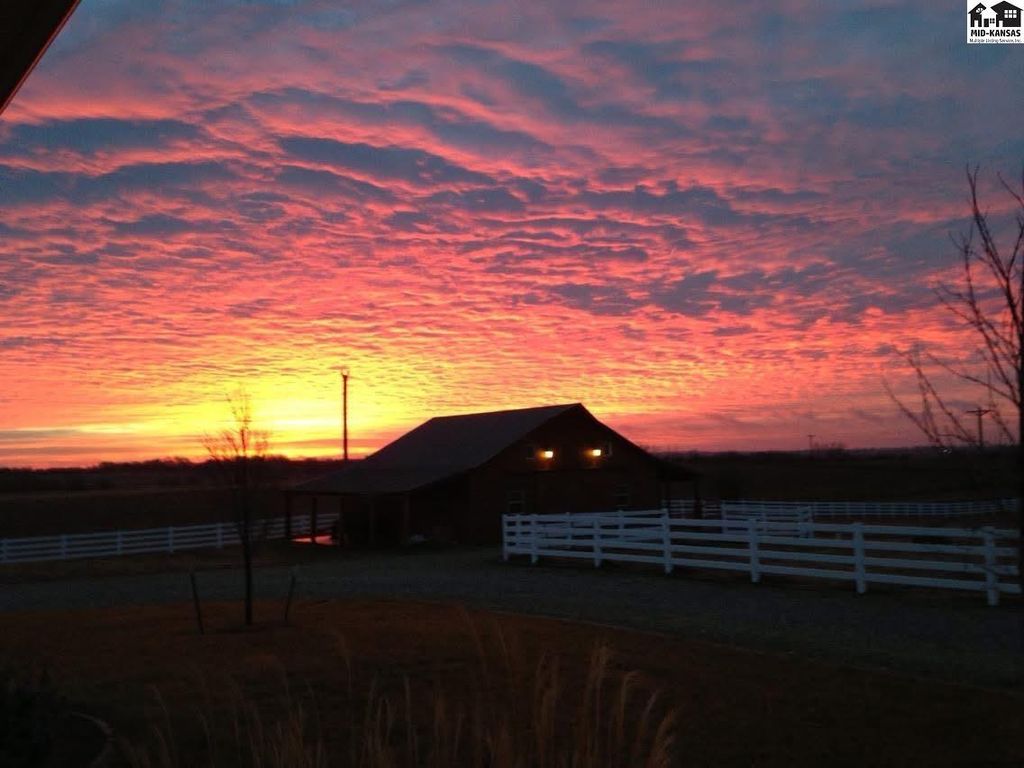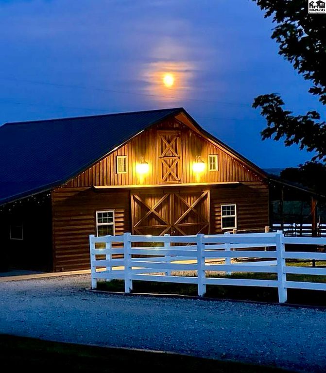Welcome to this stunning one-owner custom-built home nestled on 38.27 serene acres in Hutchinson. Thoughtfully designed&meticulously maintained, this property offers a rare combination of luxury, functionality & peaceful country living, all just minutes from town. Step inside to discover an abundance of natural light, beautiful Pella windows & incredible handcrafted Bontrager custom, solid wood cabinetry with soft-close drawers & rollout shelving. The spacious kitchen features granite countertops, ample storage, perfect for entertaining. Every bedroom is oversized & features walk-in closets, plus the entire home is wired with surround sound, a Beam central vacuum system & a security system for added peace of mind. Enjoy cozy movie nights in your very own 8-person home theater, with surround sound & projector, or host gatherings in the fully finished basement complete with a wet bar & an additional refrigerator. Additional highlights include a relaxing sunroom that can double as formal dining, private back patio with hot tub, impact-resistant composition roof (only 6 years old), two brand new Lift Master garage door openers, a 65×80 shed, 60×60 metal shed & a charming 30×40 cedar barn. Enjoy the scenic pond, vinyl fencing & wide open spaces, perfect for livestock, recreation, or just enjoying nature. This one-of-a-kind property offers the ultimate blend of custom craftsmanship, modern amenities, and quiet country charm. Come experience the lifestyle you’ve been dreaming of!