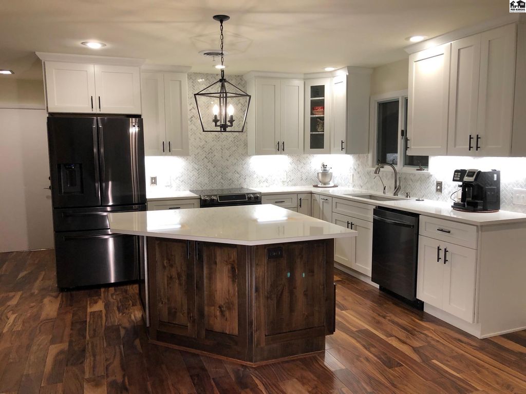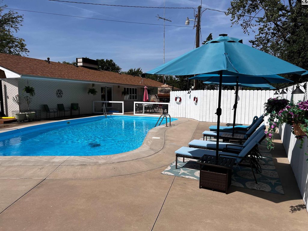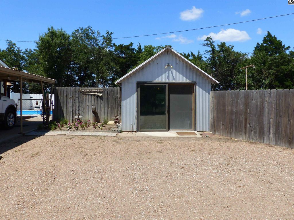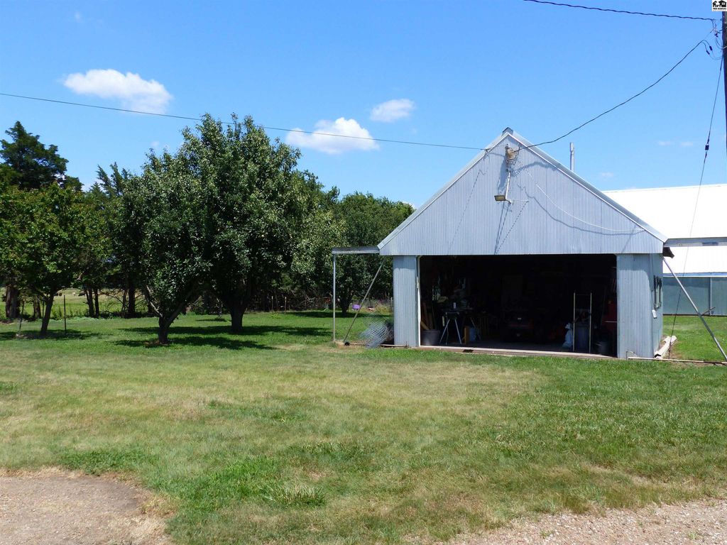 Beautifully updated country home with 15.5 acres located 5 miles West of Lyons one mile off blacktop. This home features 2700 square feet with 5 bedrooms and two bathrooms. Beautiful back yard with pool. Has privacy fence and grass area for children and or pets. This home has new kitchen, baths, flooring and carpet in bedrooms. New HVAC with heat pump, blown insulation in attic, new electrical panel, storm shelter and mature fruit trees. Property has and attached garage and carport and a detached two car garage. Three other buildings for storage one that was used as a barn with three stalls, fenced corral and auto waterer. 10 acres of pasture is also completely fence ready for your animals. Perfect hobby farm opportunity or just space for the whole family to enjoy. Owner is a licensed Real Estate Agent in Kansas Sturdi Built Storage shed is not staying with property and also small chandelier in Main bathroom is excluded from the sale as well.