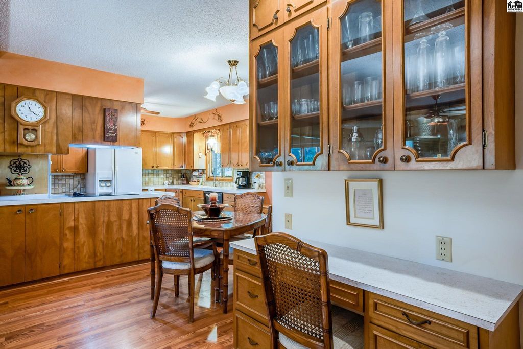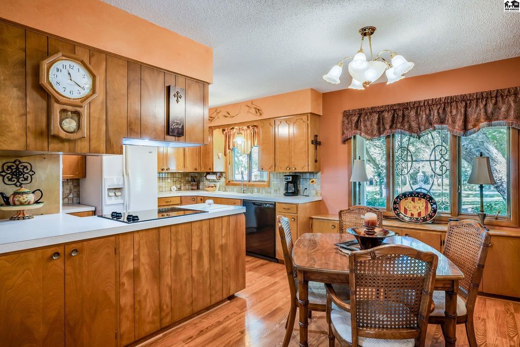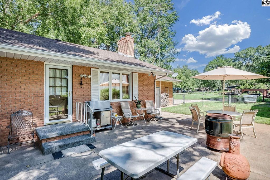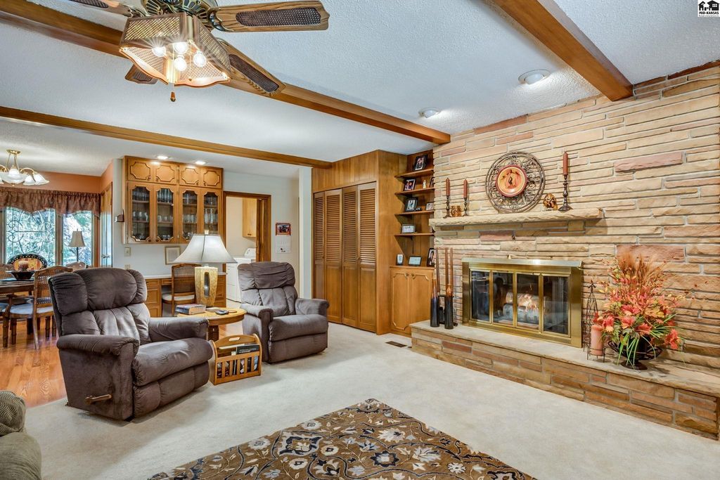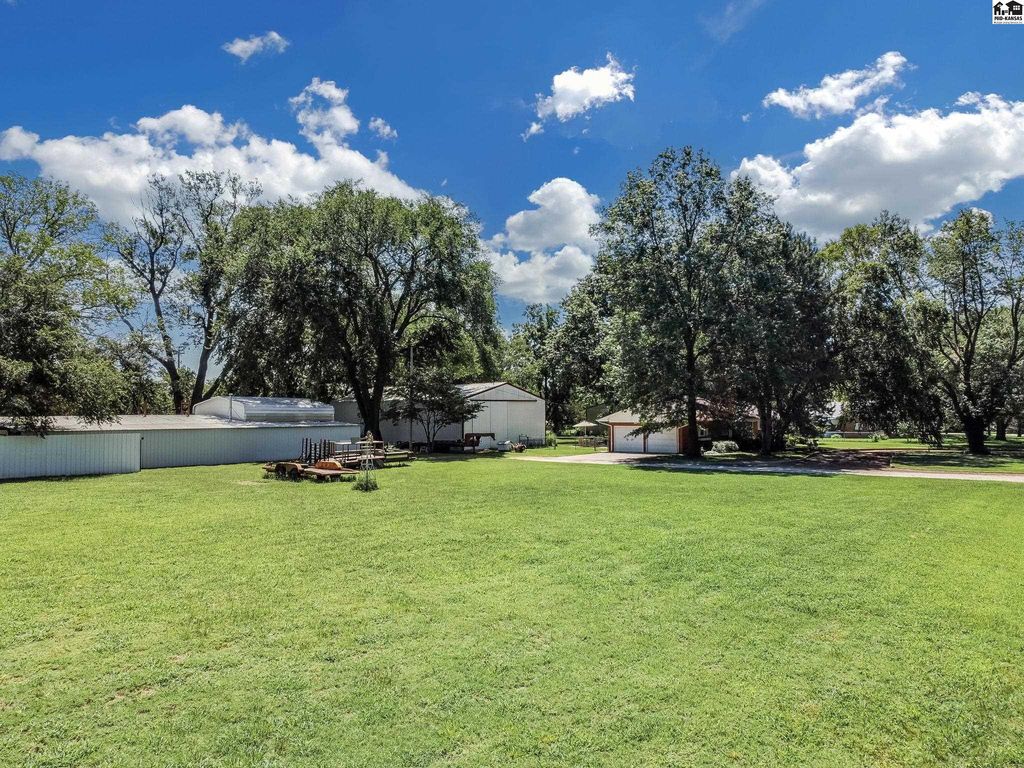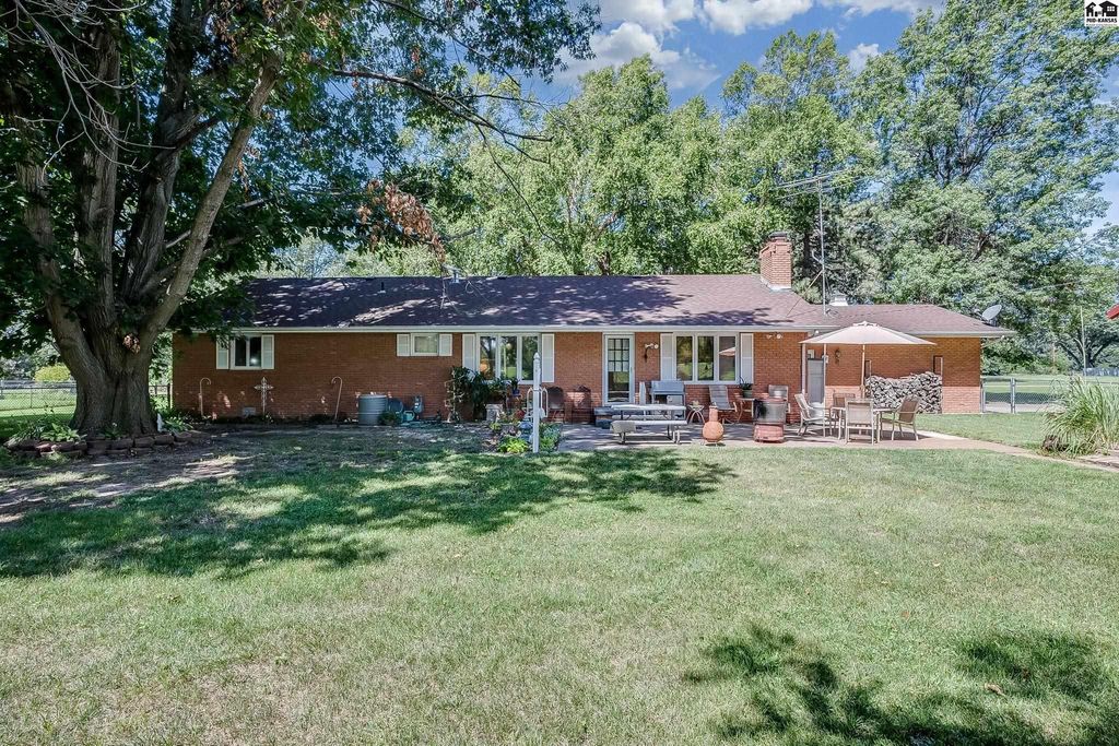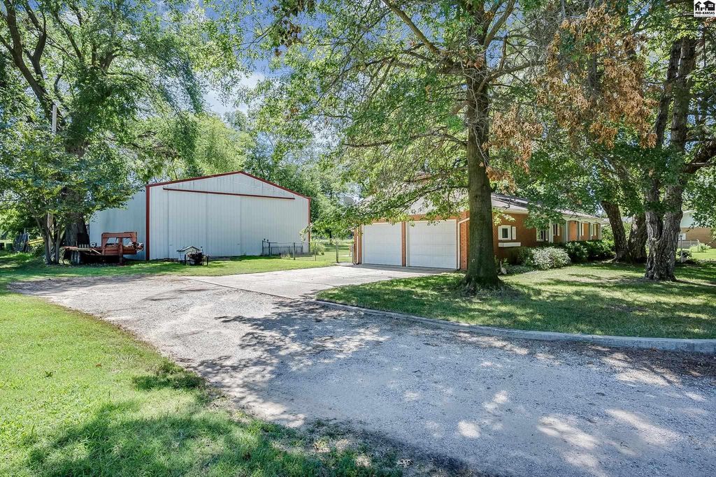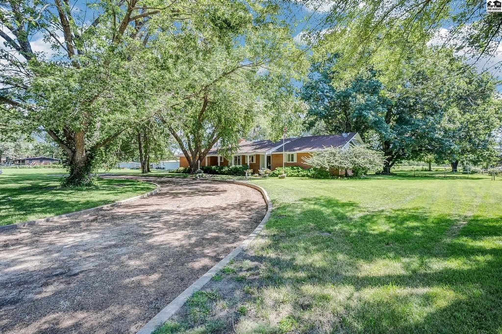 2.03 acres in a cozy neighborhood just a few minutes North of Hutchinson. Custom built brick home, 40′ x 60′ metal out building that connects to a 30′ x 16′ detached garage, a large double carport, and numerous other building used for storage. The setting will win you over! Take the circle drive right up to the front door of this beautiful home (featured in the 1966 Parade of Homes). 3 bedrooms, 2.5 baths, and plenty of space to spread out in this open floor plan design. Many custom features through the home. The family room with wood burning fireplace (gas starter) has built in bookcases on either side.