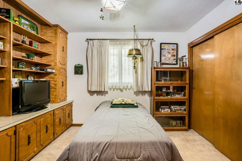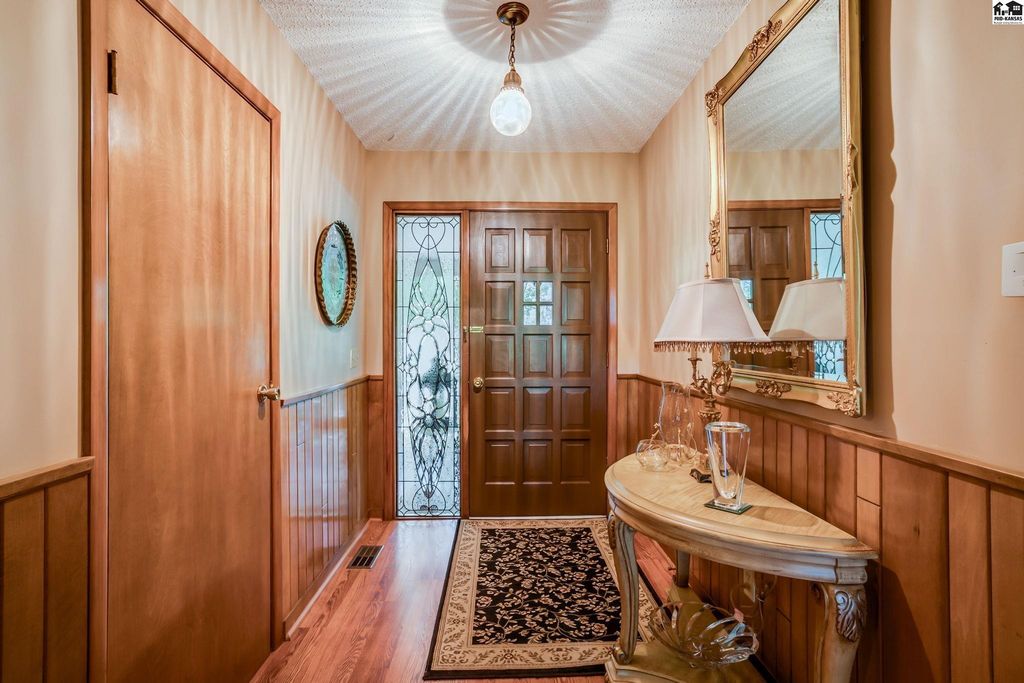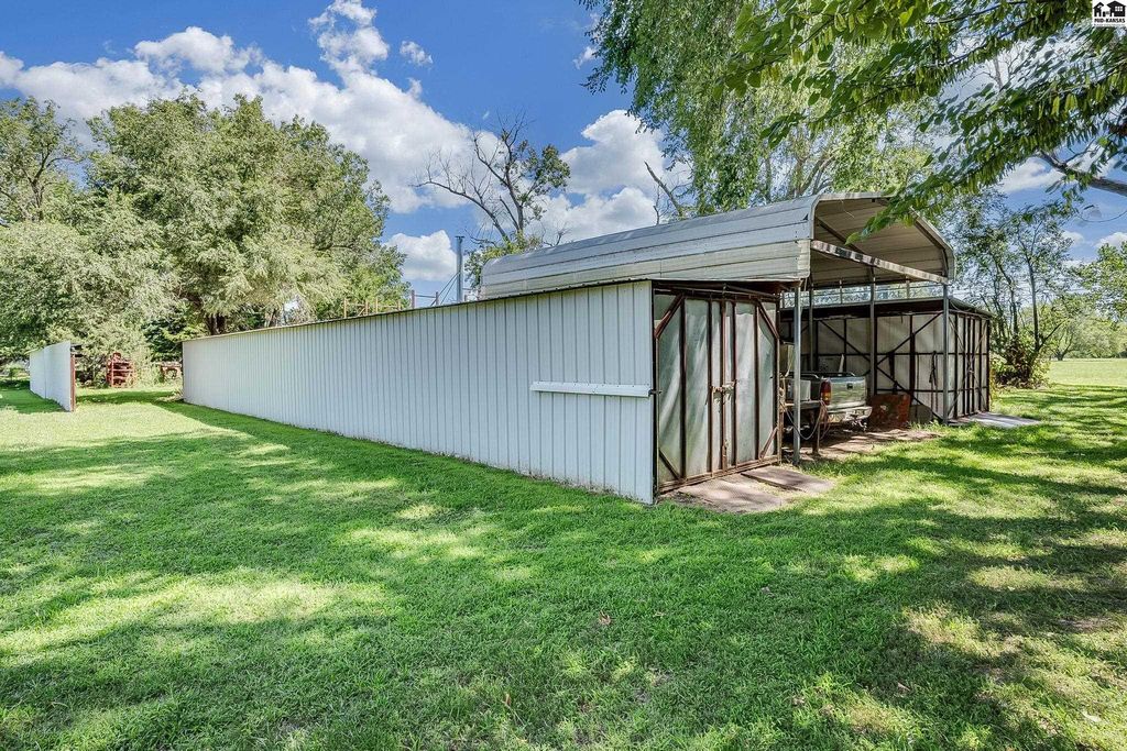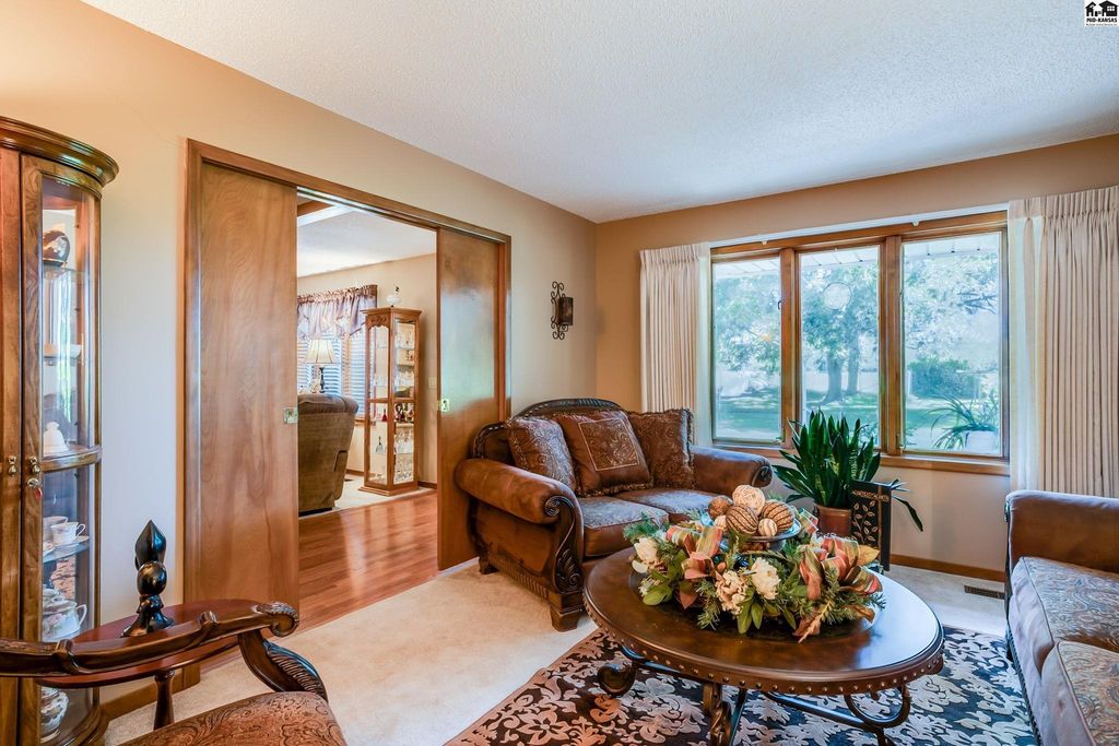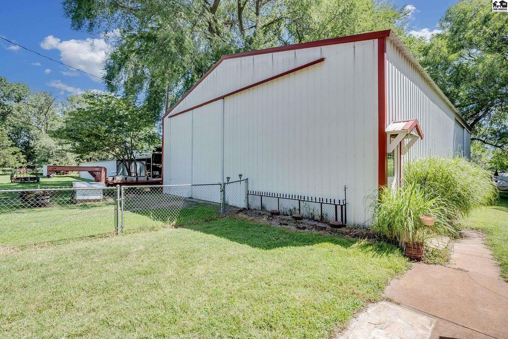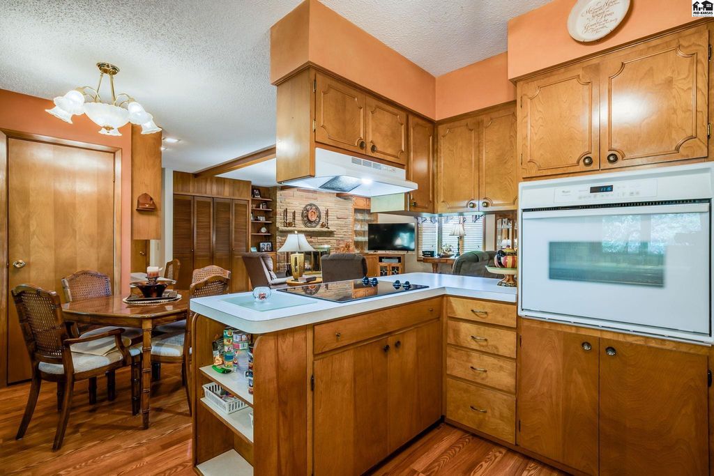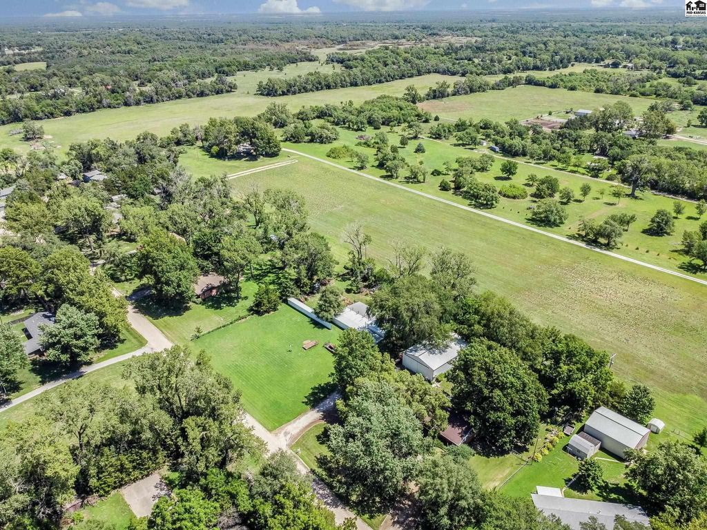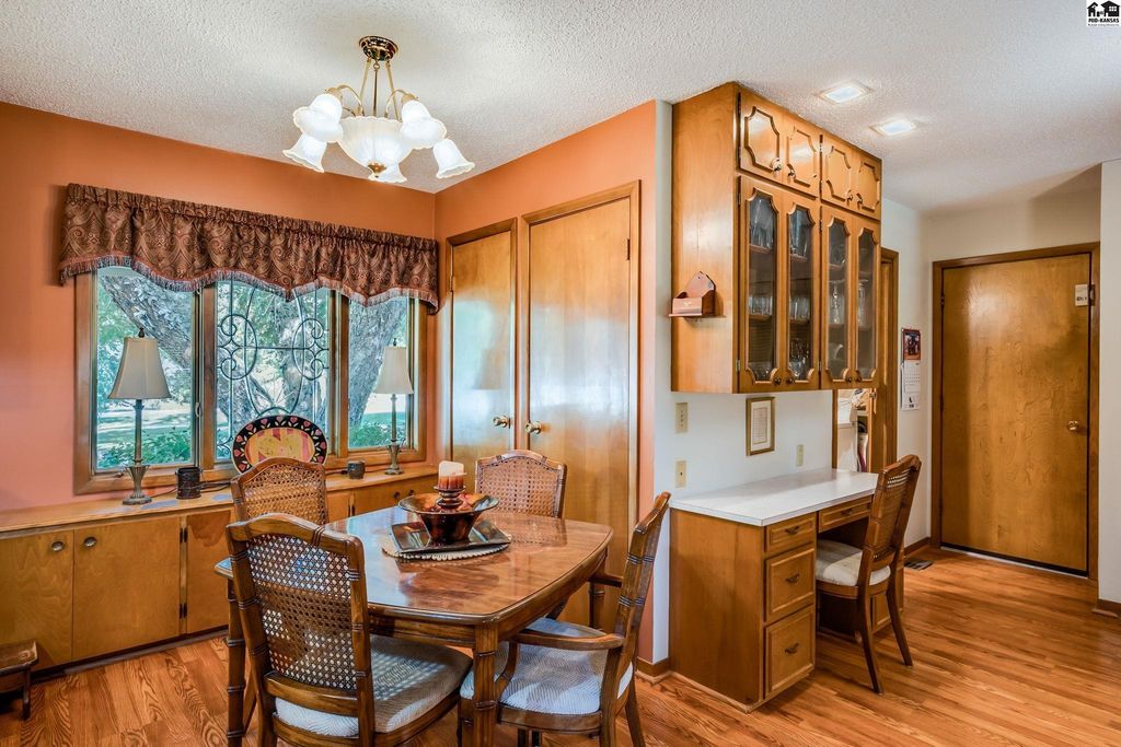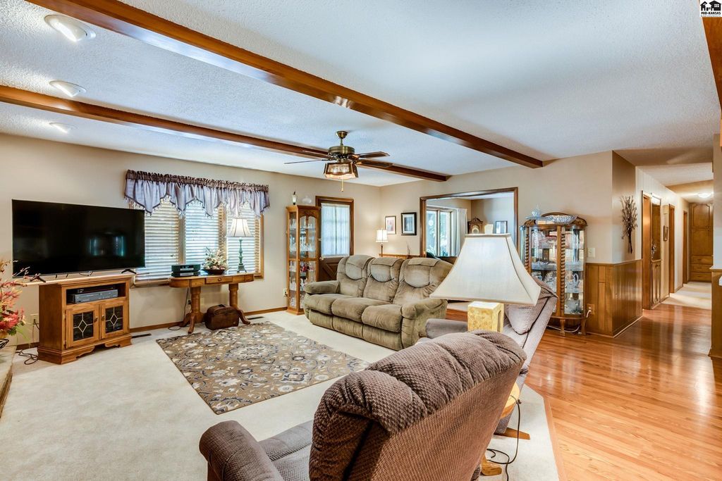 2.03 acres in a cozy neighborhood just a few minutes North of Hutchinson. Custom built brick home, 40′ x 60′ metal out building that connects to a 30′ x 16′ detached garage, a large double carport, and numerous other building used for storage. The setting will win you over! Take the circle drive right up to the front door of this beautiful home (featured in the 1966 Parade of Homes). 3 bedrooms, 2.5 baths, and plenty of space to spread out in this open floor plan design. Many custom features through the home. The family room with wood burning fireplace (gas starter) has built in bookcases on either side.